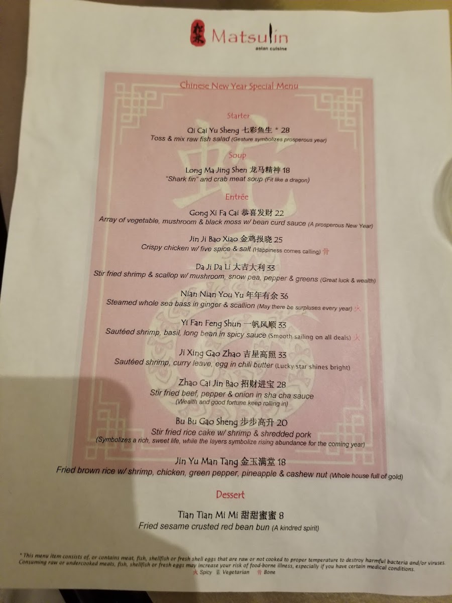 Matsulin’s menu is a treasure trove of delightful options. You can't miss the Qi Cai Yu Sheng starter at $28, a vibrant salad steeped in tradition, bursting with fresh vegetables and a tangy dressing that awakens the palate. Soups such as the Long Ma Jing Shen $18 soothe the soul with their rich and flavorful broth. For the main course, dive into the Gong Xi Fa Cai for $22, or savor the tender chicken of the Jin Ji Bao Xiao for $25. Those seeking elegance will love the Nian Nian You Yu priced at $36, which beautifully exemplifies a harmonious blend of flavors that will linger in your memory long after your last bite.